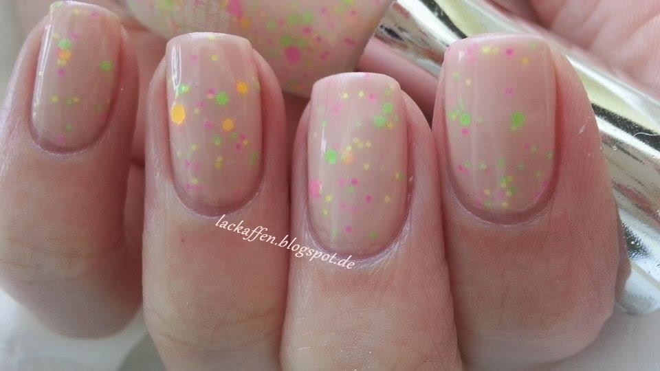 Base rosa / hexagonaler Neonglitter in fuchsia, flieder & blau / etwas kleinerer hexagonaler Neonglitter in grün / Neon-Mikroglitter in pink & flieder (1 Schicht über Orly - Lollipop)